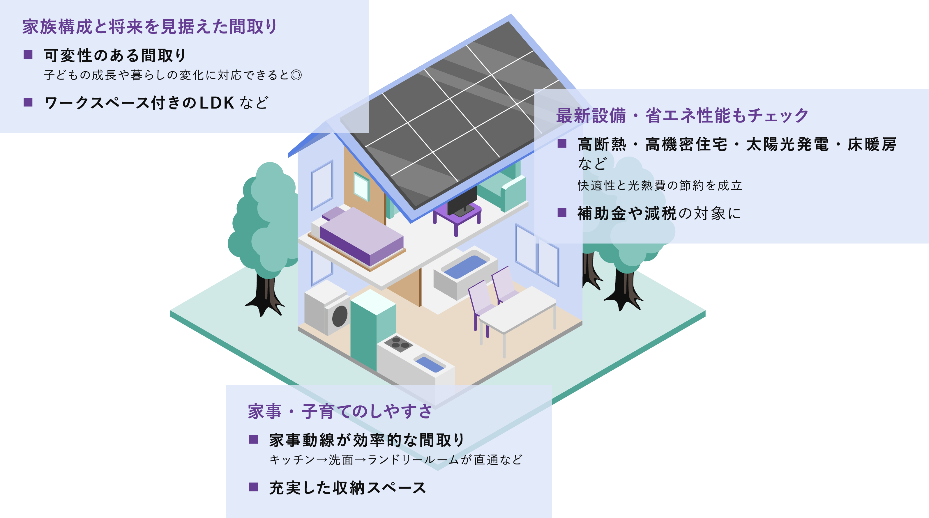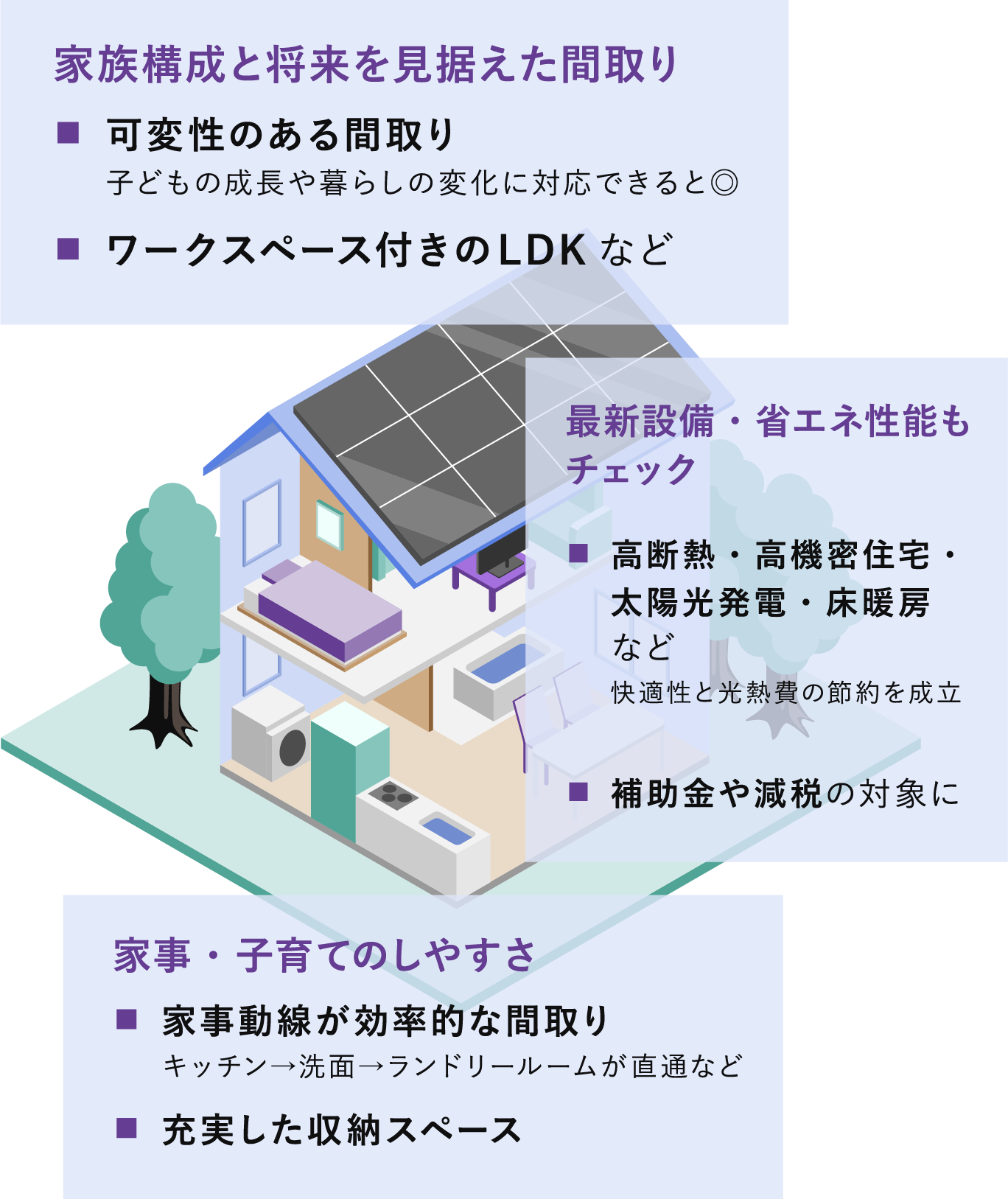 子育て期から老後までを見据えて、利便性と安全性のバランスがとれたエリアを選びましょう。 -